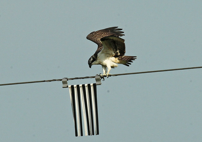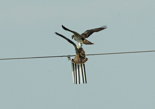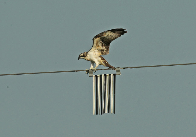 Geschicklichkeitsübungen auf der Markierung des Leiterseils. Durch eine am Draht angebrachte Spirale finden die Füße des Jungadlers Halt.