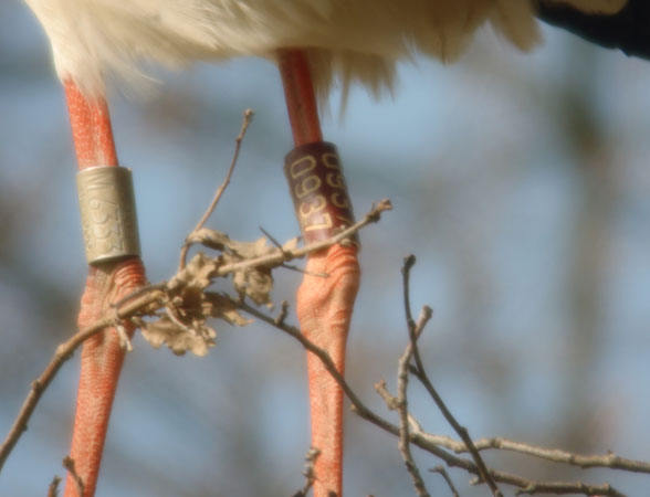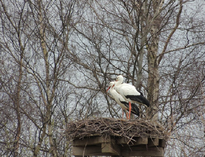 Neuansiedlung eines Storchenpaares auf dem Horst beim Naturgarten nach 9 Jahren Warten. Das Weibchen stammt aus Belgien, das verraten die beiden Ringe, die links und rechts am Bein sitzen. Die Herkunft des Partners ist unbekannt. Es wird eifrig gebrütet, doch aus dem Gelege schlüpfen keine Jungvögel. Es ist wahrscheinlich das erste Brutjahr des Weibchens. Es ist vier Jahre alt.