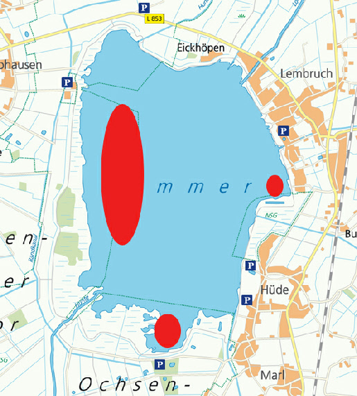 Die roten Felder auf der Karte markieren Bereiche, an denen man am See im Herbst gute Chancen hat, Löffelenten in größerer Anzahl zu entdecken.